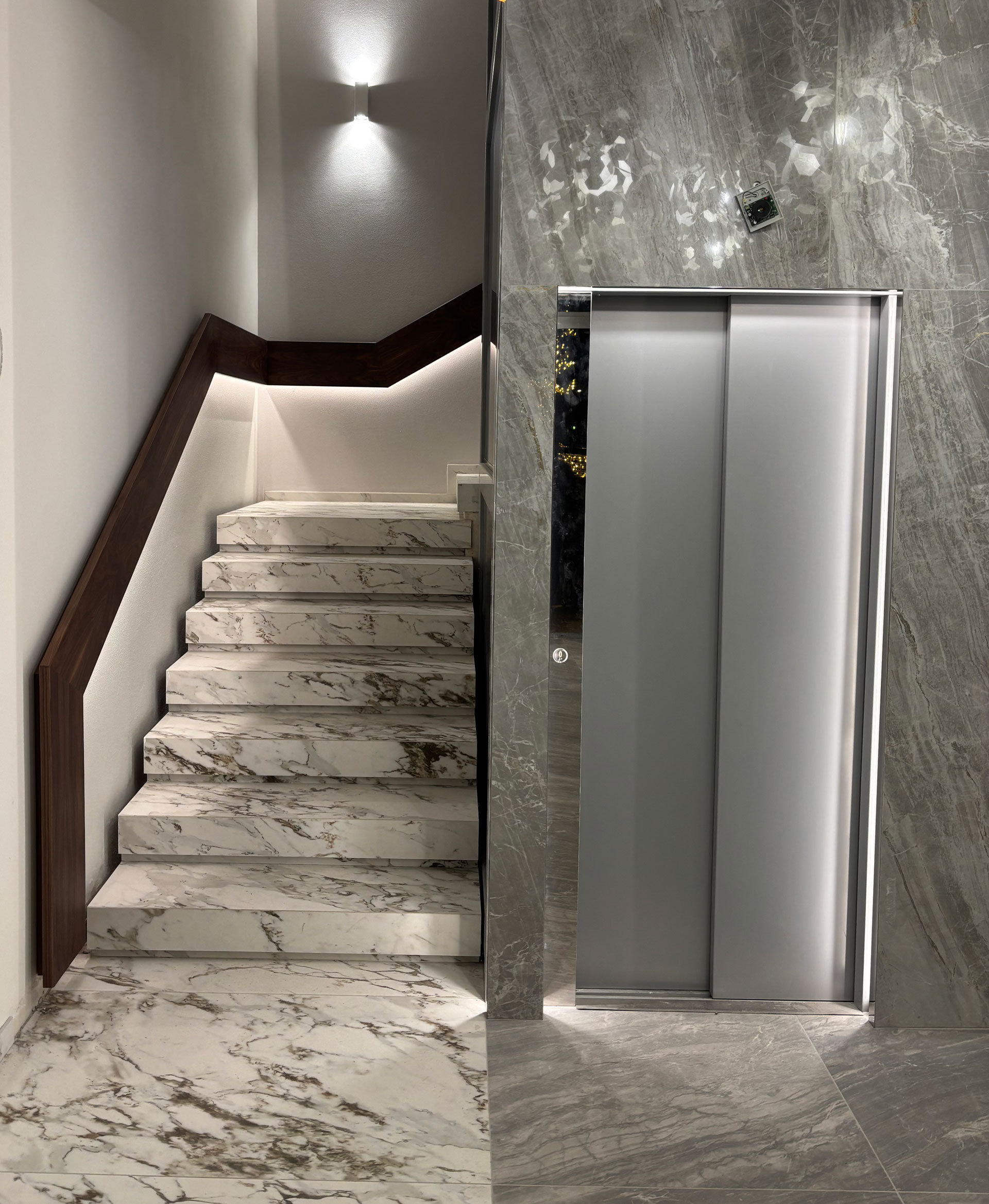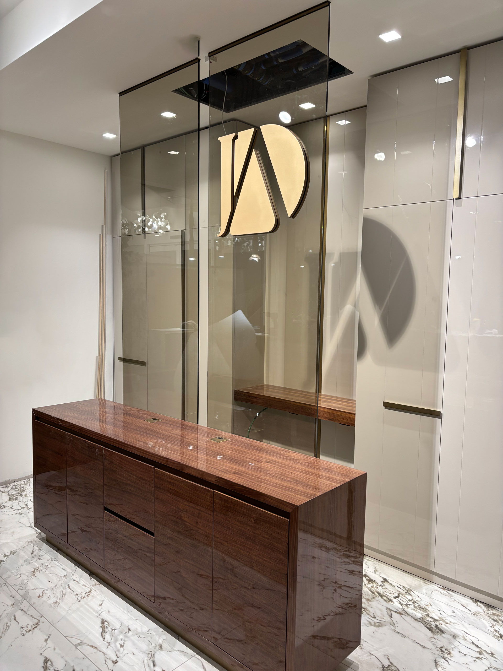 For a corporate office complex in Tuscany, we created custom furnishings designed to combine functionality, comfort, and elegance. From the wood paneling adorning the staircase handrail to the reception desk, including the office and meeting room furnishings, every aspect was meticulously considered.