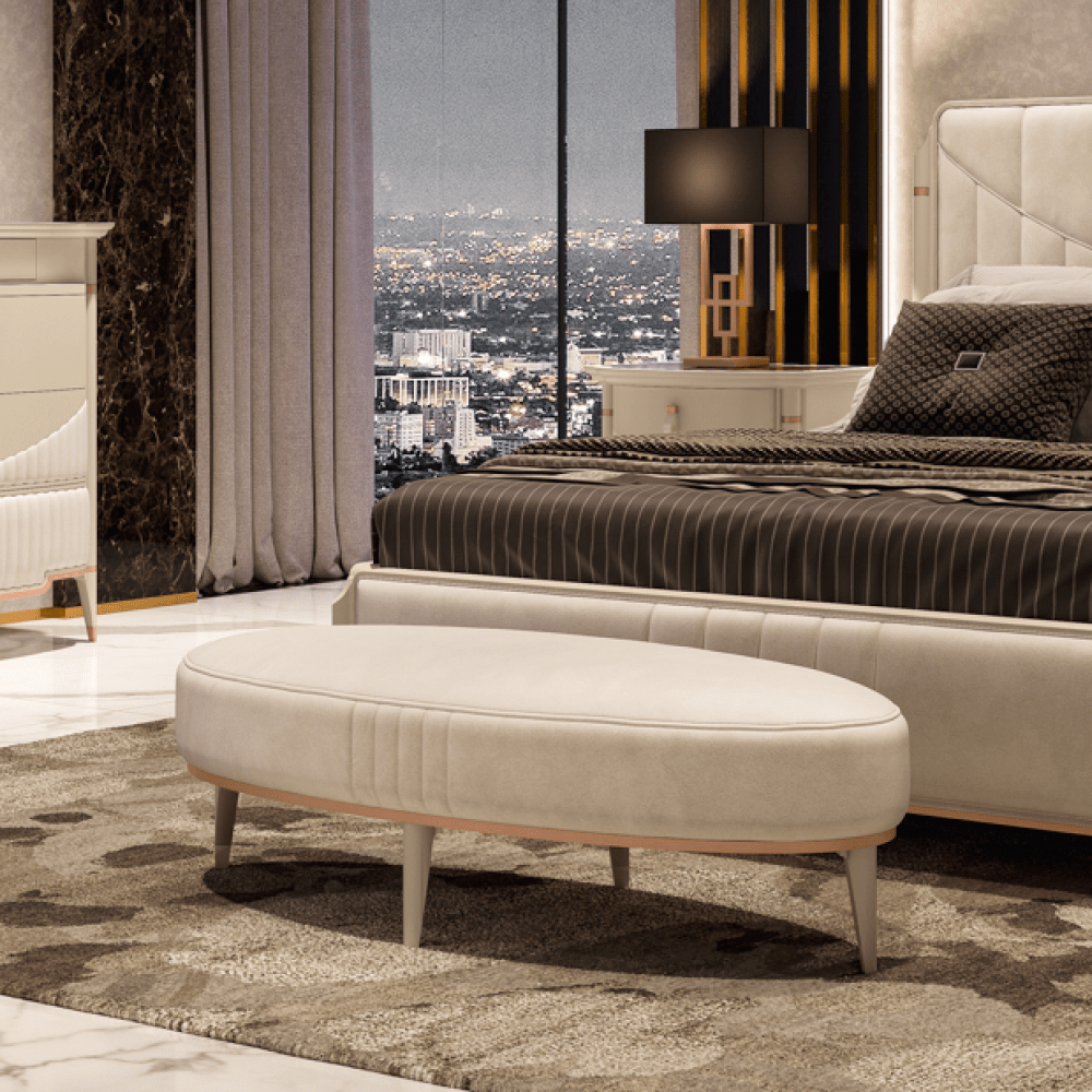 Panchetta imbottita in tecnonabuk, finitura laccata e inserti in finitura metallizzata